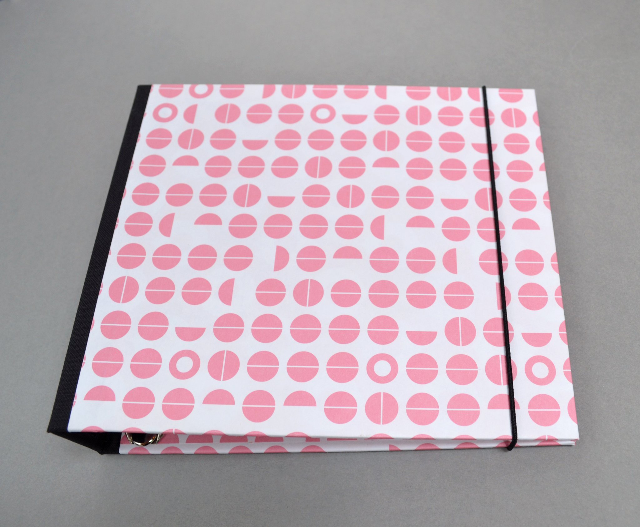 Das Album ist innen und außen mit Musterpapier in den Farben rosa und weiß bezogen.